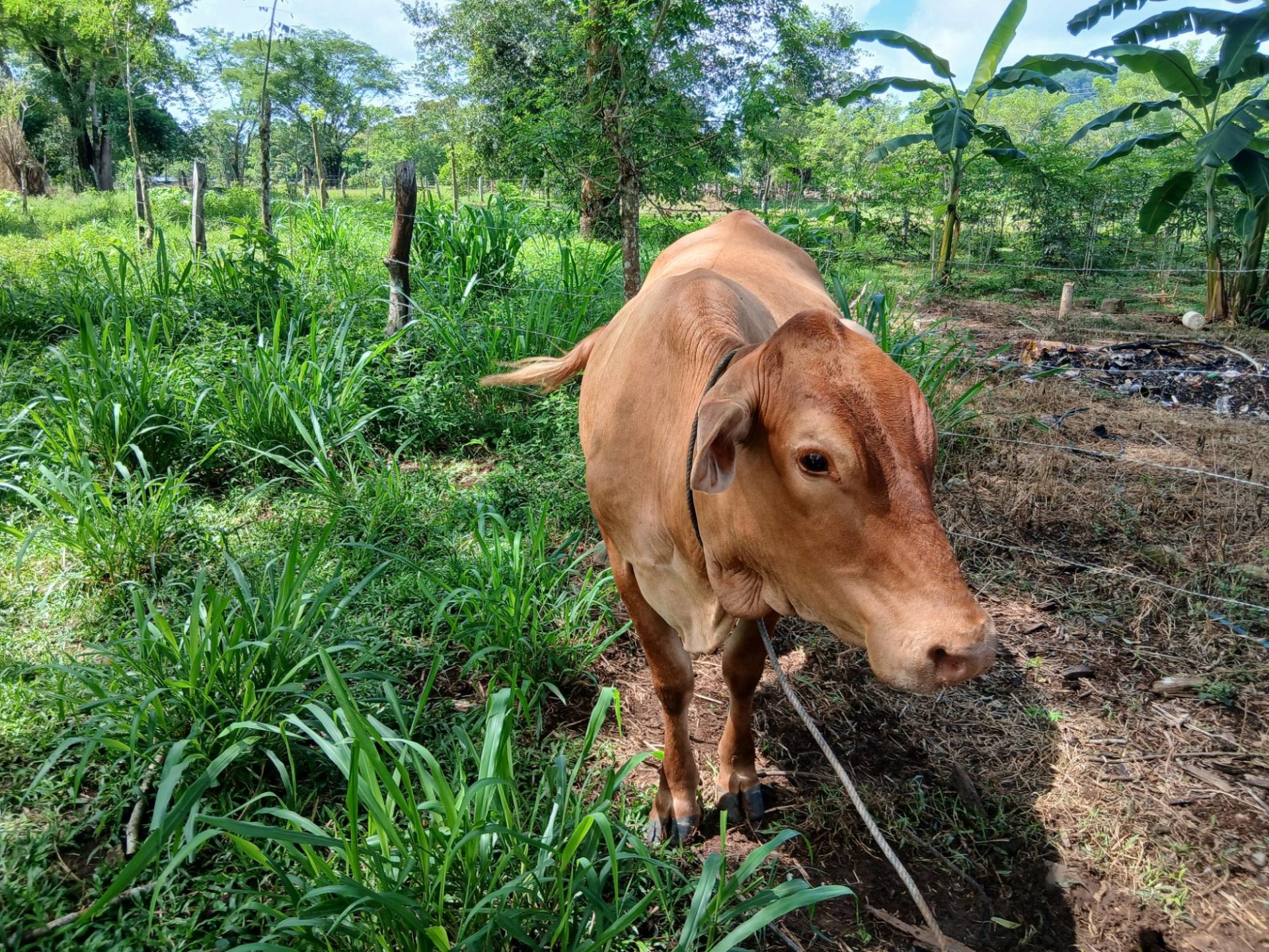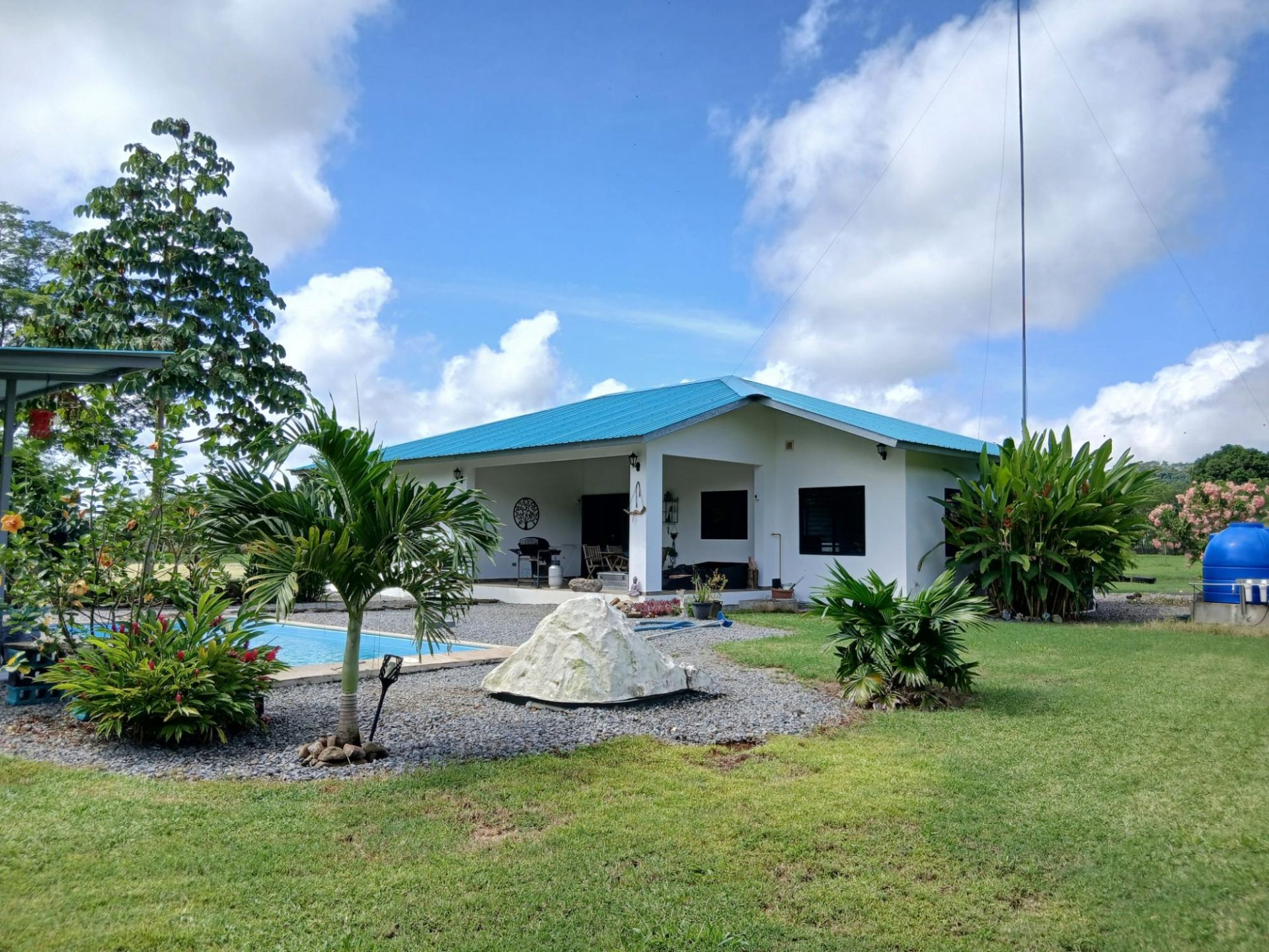 Traiga sus muebles y objetos personales, todo lo demás ya está listo para que se sienta como en casa. La finca de 5 hectáreas está dividida en tres partes, completamente vallada y se encuentra en Zambrano, a solo 20 minutos en coche de David, en una carretera de grava pero muy bien acondicionada. A Boquete se llega en 45 minutos. En la parcela de 1,5 hectáreas, muy bien cuidada y con numerosos árboles frutales como papaya, mango, aguacate, plátano, cítricos, etc., se encuentra la casa principal, de solo 2,5 años de antigüedad, con dos dormitorios, dos baños, una gran sala de estar con cocina, un estudio y un lavadero. Además, hay una gran terraza cubierta, una piscina con otra pequeña terraza y dos contenedores marítimos que se utilizan como taller y almacén. La casa puede funcionar de forma totalmente autónoma, ya que cuenta con un sistema de energía solar, un pozo y agua caliente tratada con un módulo solar. Pero también dispone de agua y electricidad municipales. La parte central de la propiedad, de 3 hectáreas, está plantada con palmeras aceiteras, que están entrando en producción. En la parte restante, de 0,5 hectáreas, hay otra casa sencilla y más antigua, en la que actualmente vive el empleado. Allí hay además un gran huerto, un gallinero e incluso hay espacio para una vaca. Todas las parcelas son accesibles directamente desde la calle, por lo que no hay ningún impedimento para dividirlas. ¿Necesita más terreno? No hay problema, se puede adquirir más terreno adyacente a esta propiedad.